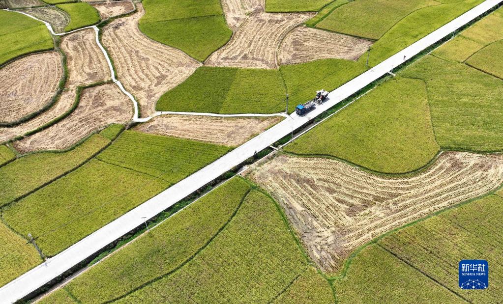 8月23日拍攝的貴州省綏陽縣旺草鎮(zhèn)萬畝大壩水稻收割現(xiàn)場(chǎng)(無人機(jī)照片)。