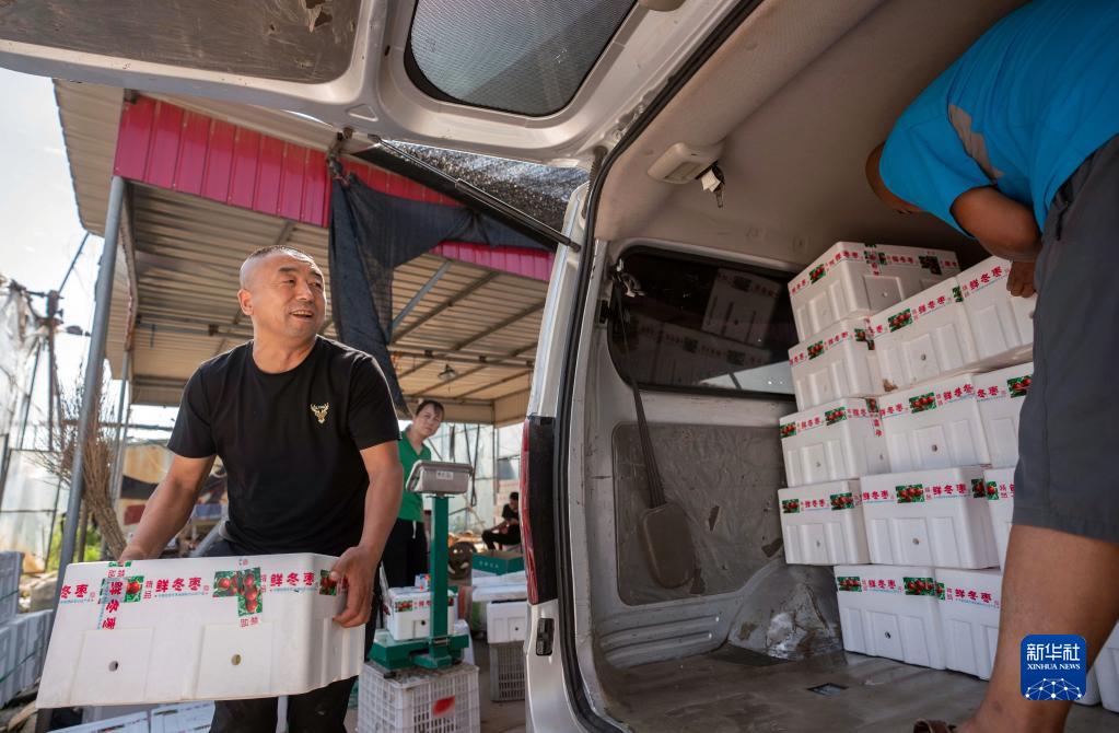 8月23日,在黃驊市滕莊子鎮一家冬棗種植合作社,客商把包裝好的冬棗裝車。