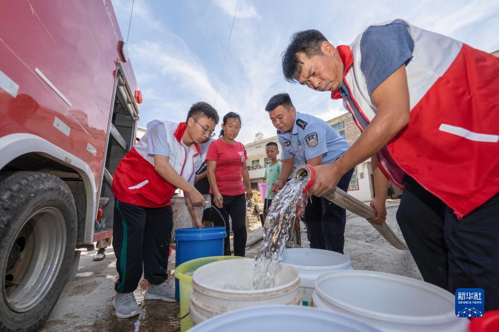 8月23日,在貴州省銅仁市萬山區(qū)魚塘鄉(xiāng)高峰村,志愿者給村民送水。
