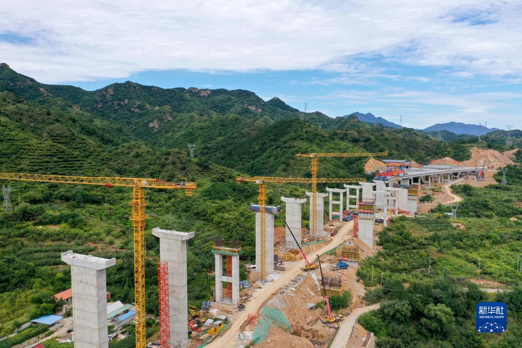 這是8月23日拍攝的首都地區環線高速公路承德至平谷段四頃地特大橋施工現場(無人機照片)。 新華社發(王立群 攝)