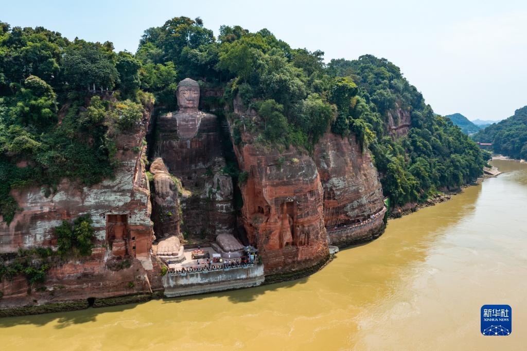 這是8月23日拍攝的露出底座的樂山大佛(無人機照片)。