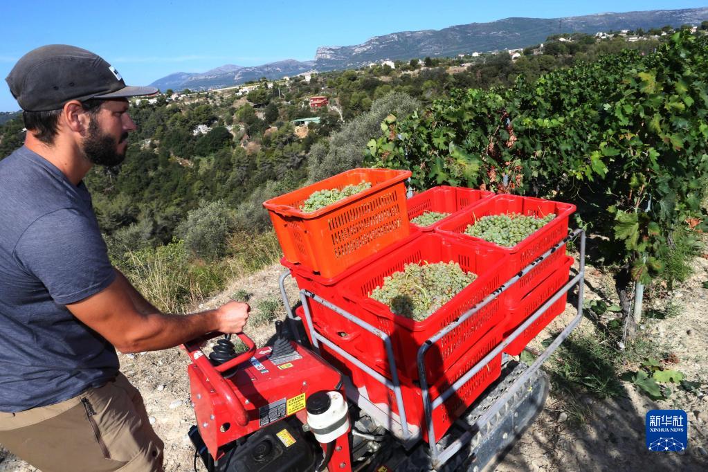 8月23日,工作人員在法國尼斯一家酒莊的葡萄園收割葡萄。