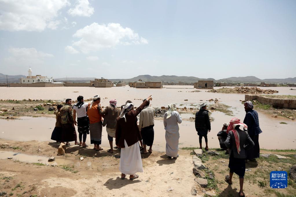 8月23日,在也門扎馬爾省馬巴爾地區(qū),人們查看被洪水淹沒的土地。
