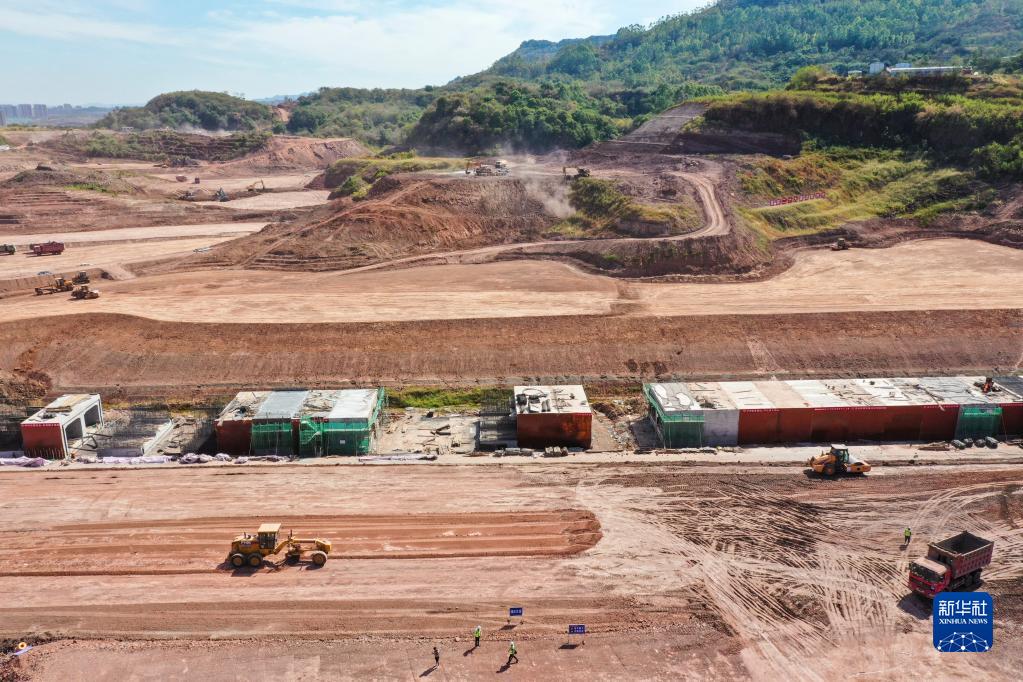 這是8月23日拍攝的新建重慶至黔江鐵路重慶東站動車所路基項目施工作業現場(無人機照片)。