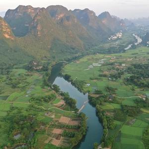 時下,廣西桂林市陽朔縣遇龍河沿岸山清水碧,草木蔥郁,在藍天白云掩映下,一派生機盎然景象。