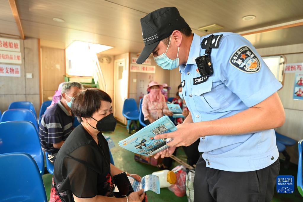 8月23日,在渡輪“黃瓜號(hào)”上,許偉偉向村民宣傳反詐知識(shí)。