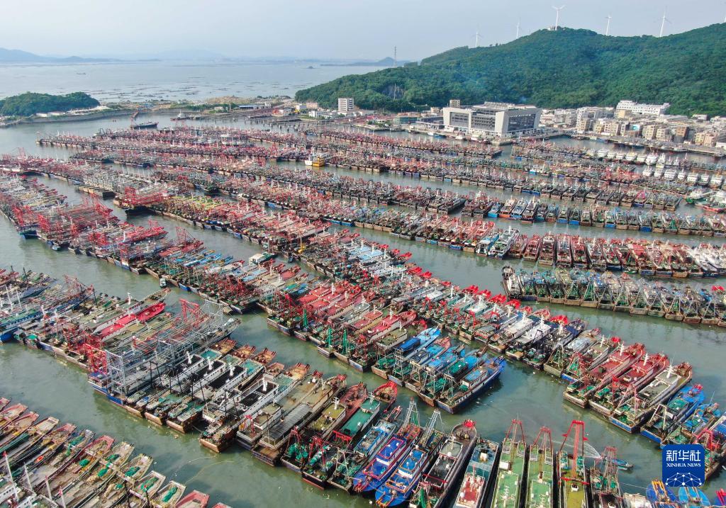 8月24日,在廣東陽江市海陵島閘坡國家級中心漁港,停滿了歸港避風的漁船(無人機照片)。