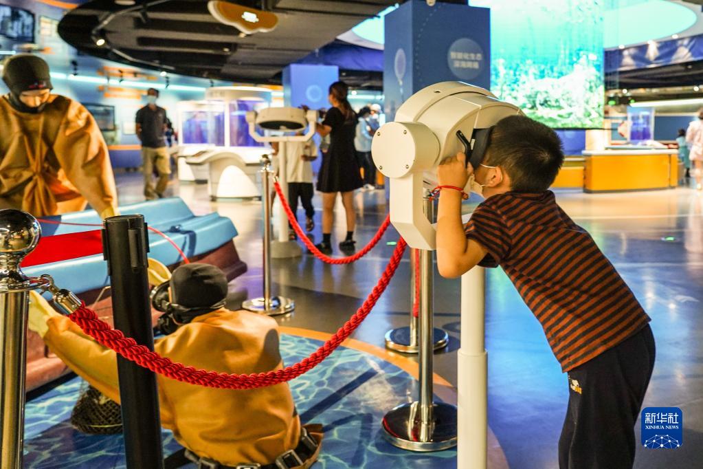 8月24日,小朋友在威海海洋科技館內參觀游玩。