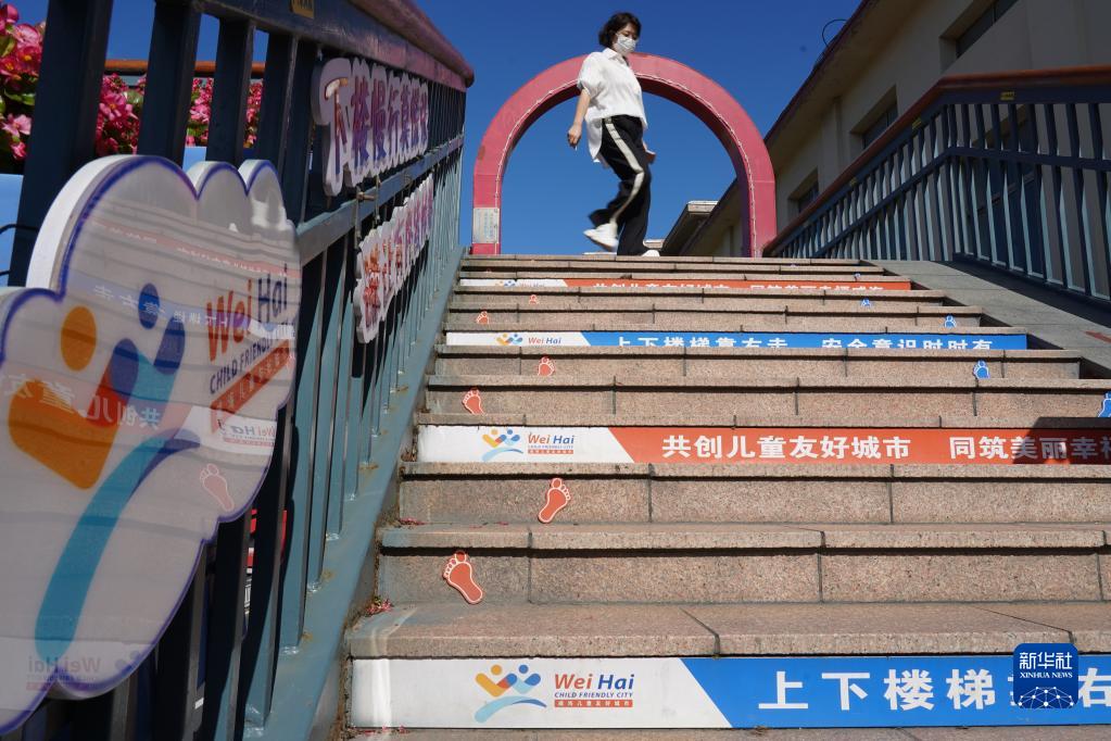 8月24日,威海市文化東路天橋上的標識提示過往兒童注意安全。