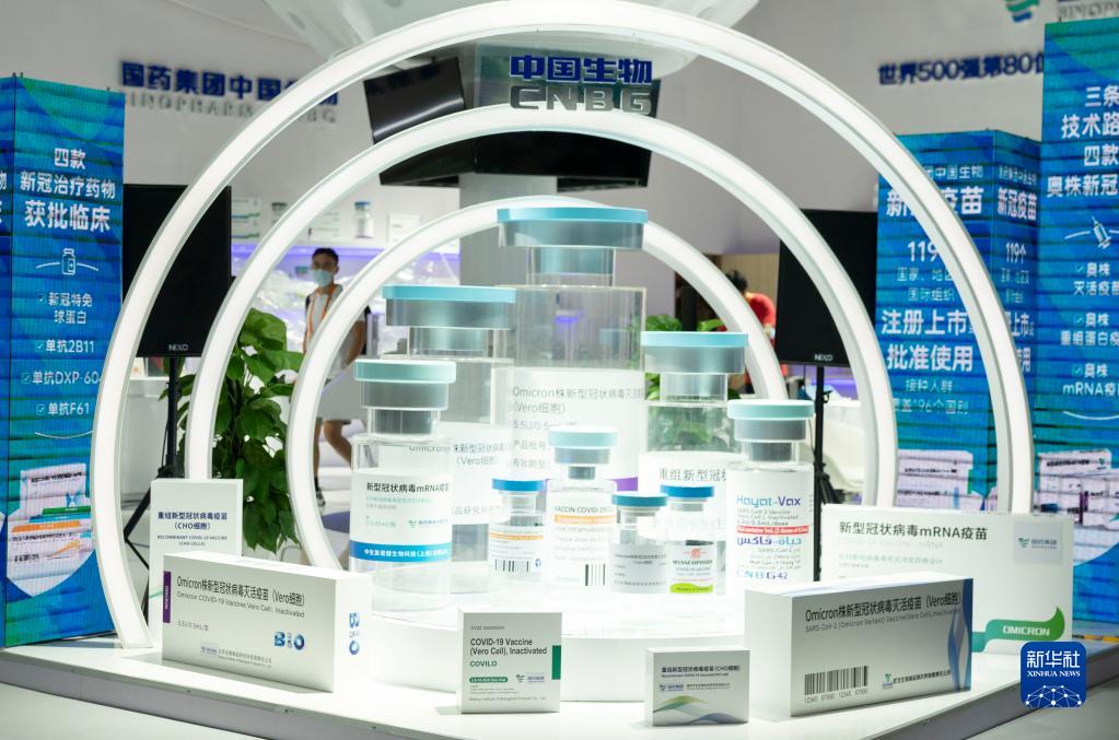 這是8月28日在國家會議中心服貿會媒體探營活動中拍攝的中國生物展臺。