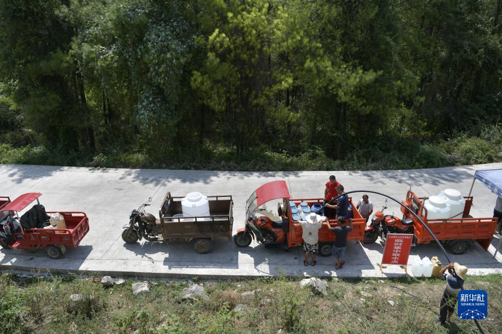 8月25日,在遵義市務(wù)川縣分水鎮(zhèn)天山村,當(dāng)?shù)卣M織村民在抗旱救災(zāi)臨時(shí)集中取水點(diǎn)取水。