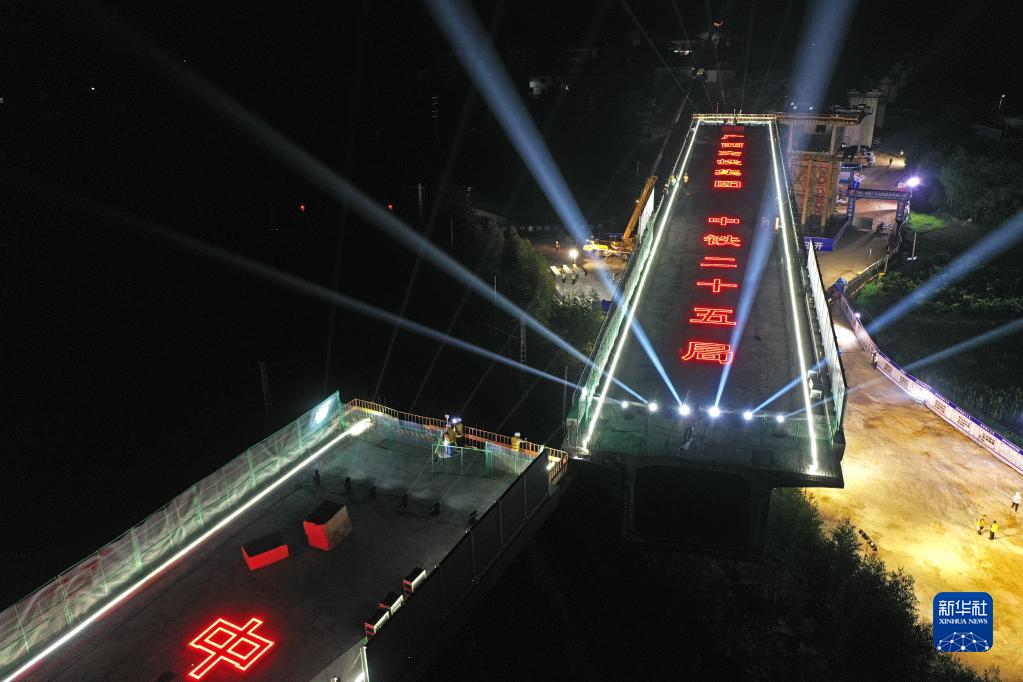 當日,廣西南(寧)玉(林)鐵路全線最大噸位雙幅轉體橋——福慶特大橋跨湘桂鐵路轉體橋在順時針旋轉后成功對接,兩幅對接后的轉體橋成為上跨湘桂鐵路的空中走廊,標志著南玉鐵路建設取得重大突破。福慶特大橋全長945米,轉體部分的橋梁梁體總長220米,總重量超過1.2萬噸。