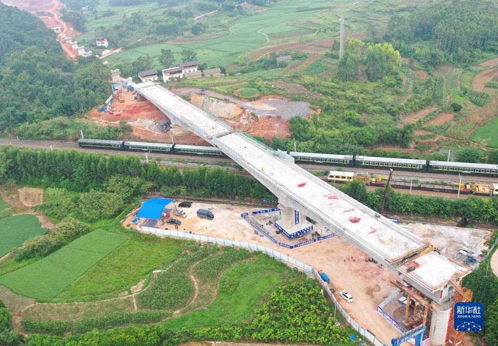 當日,廣西南(寧)玉(林)鐵路全線最大噸位雙幅轉體橋——福慶特大橋跨湘桂鐵路轉體橋在順時針旋轉后成功對接,兩幅對接后的轉體橋成為上跨湘桂鐵路的空中走廊,標志著南玉鐵路建設取得重大突破。福慶特大橋全長945米,轉體部分的橋梁梁體總長220米,總重量超過1.2萬噸。