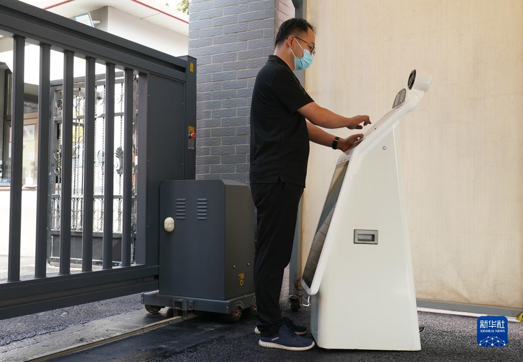 8月30日,人大附中實驗小學的老師在調試智能測溫門崗機器人。