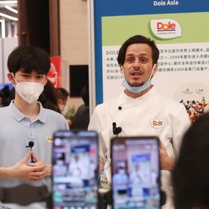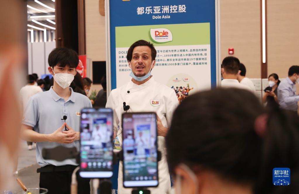 8月30日,一名來自法國的美食主播在對接會現場直播美食制作。