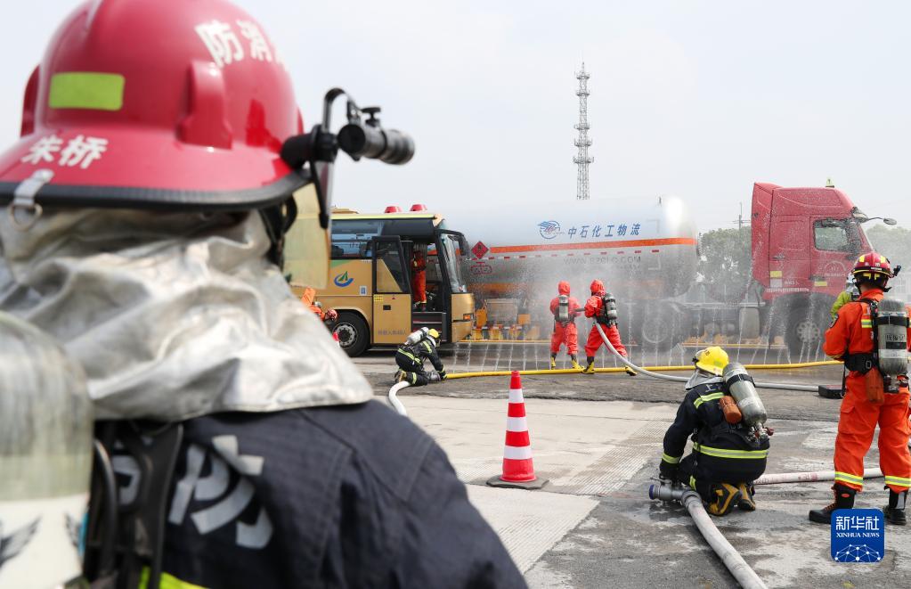8月30日,消防救援人員在演練中對存在危化品泄漏的運輸車輛進行水幕隔離作業。
