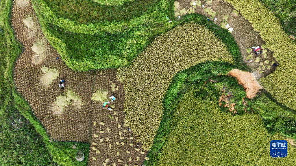 8月30日,村民在羅甸縣沫陽(yáng)鎮(zhèn)紅星村收割稻谷(無(wú)人機(jī)照片)。