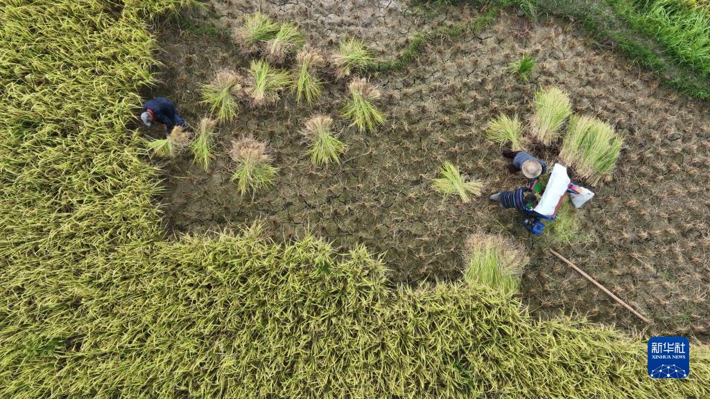 8月30日,村民在羅甸縣沫陽鎮紅星村收割稻谷(無人機照片)。