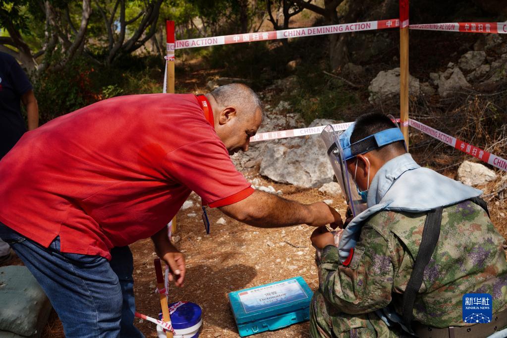 8月30日,在黎巴嫩南部辛尼亞村掃雷訓練場,考官在銷毀作業中檢查排爆手作業效果。