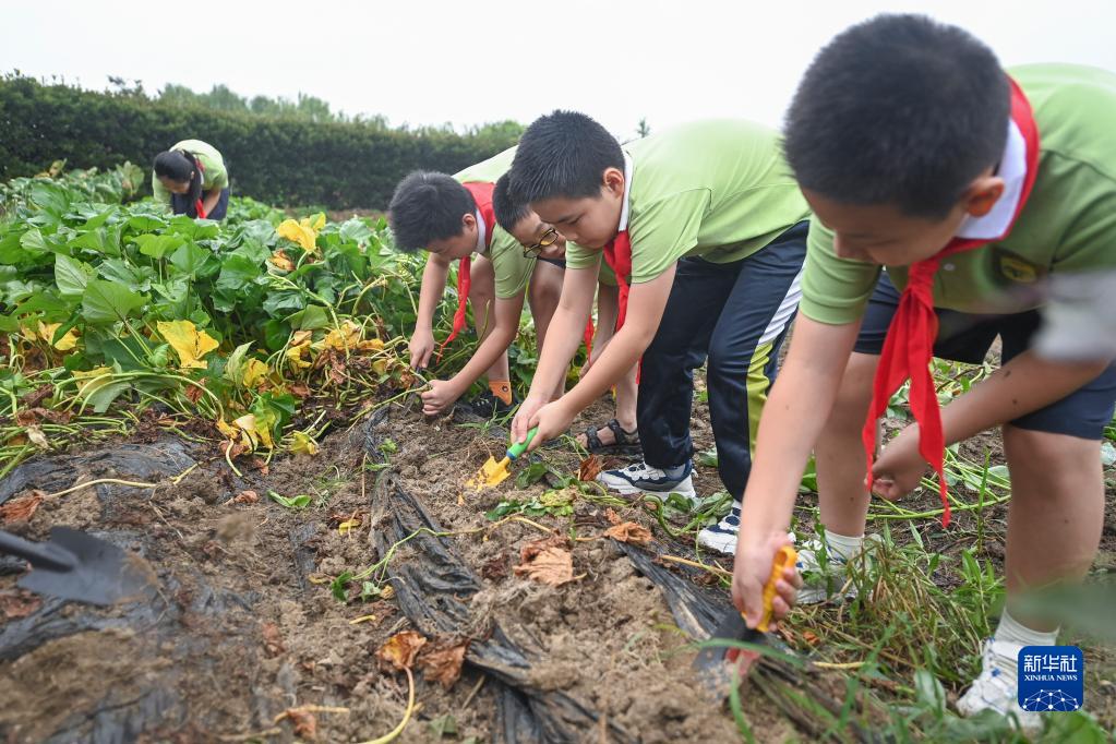 當(dāng)日,在浙江省嘉興市南湖區(qū)新豐鎮(zhèn)中心小學(xué)的校園農(nóng)場內(nèi),學(xué)生們參加收番薯、除草、澆水等特色勞動課程,開啟新學(xué)期的“開學(xué)第一課”。新豐鎮(zhèn)中心小學(xué)是浙江省拓寬校外勞動實踐途徑試點學(xué)校,依托校園農(nóng)場形成了特色鮮明的勞動課程。