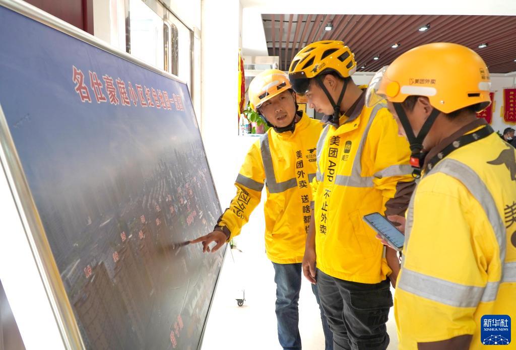 8月31日,單縣園藝街道名仕豪庭小區(qū)“暖新驛站”里張貼了小區(qū)航拍圖,幾名外賣配送員在觀看圖片熟悉小區(qū)道路。
