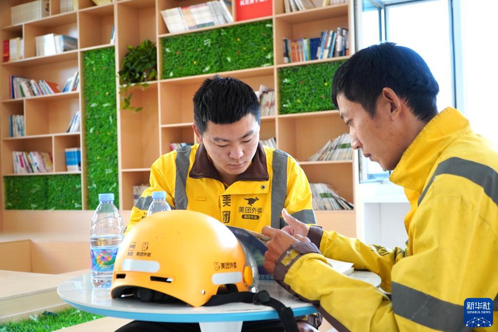 8月31日,在單縣園藝街道黃樓社區“暖新驛站”,兩名外賣配送員在閱讀。