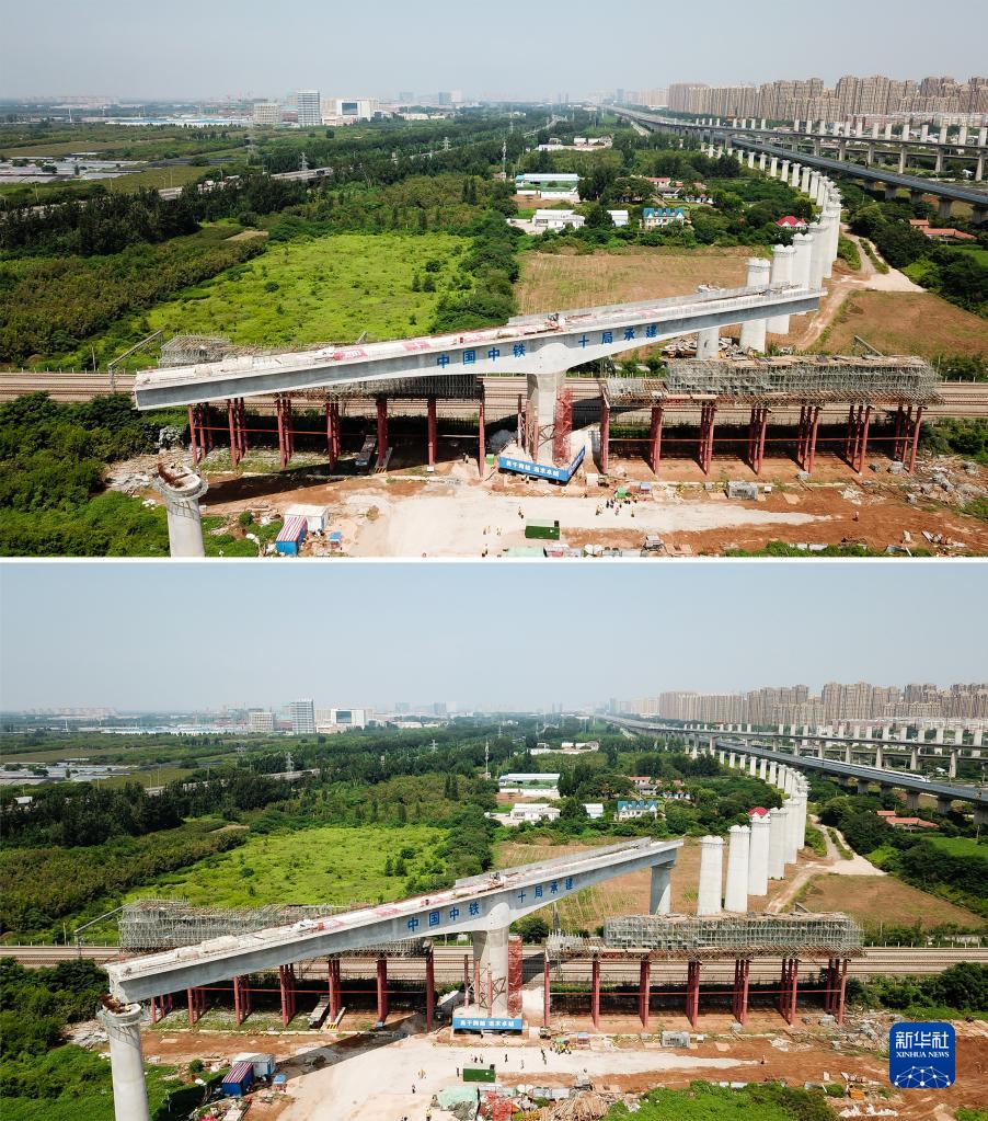 拼版照片:上圖為8月31日,由中鐵十局承建的濟鄭高鐵(山東段)跨京滬鐵路轉體橋正在進行“轉身”作業(無人機照片);下圖為8月31日,濟鄭高鐵(山東段)跨京滬鐵路轉體橋完成“轉身”作業。