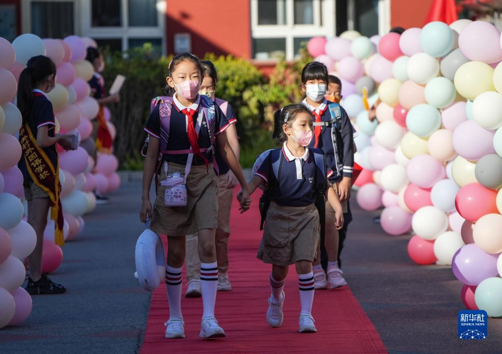 9月1日,在北京市中關村外國語學校小學部,同學們走進學校。