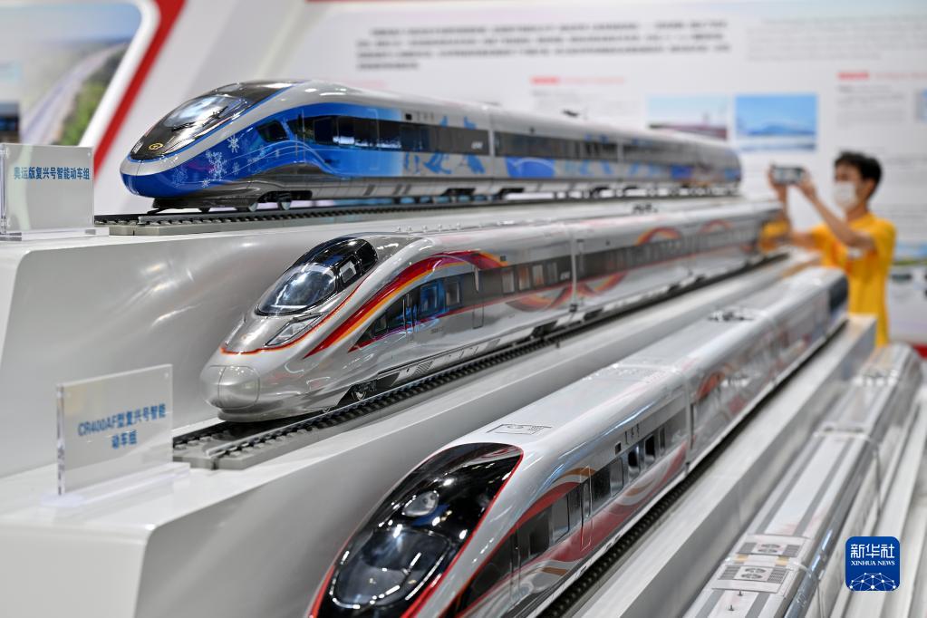 9月1日,觀眾在國家會議中心內的國鐵集團展臺拍攝智能動車組模型。