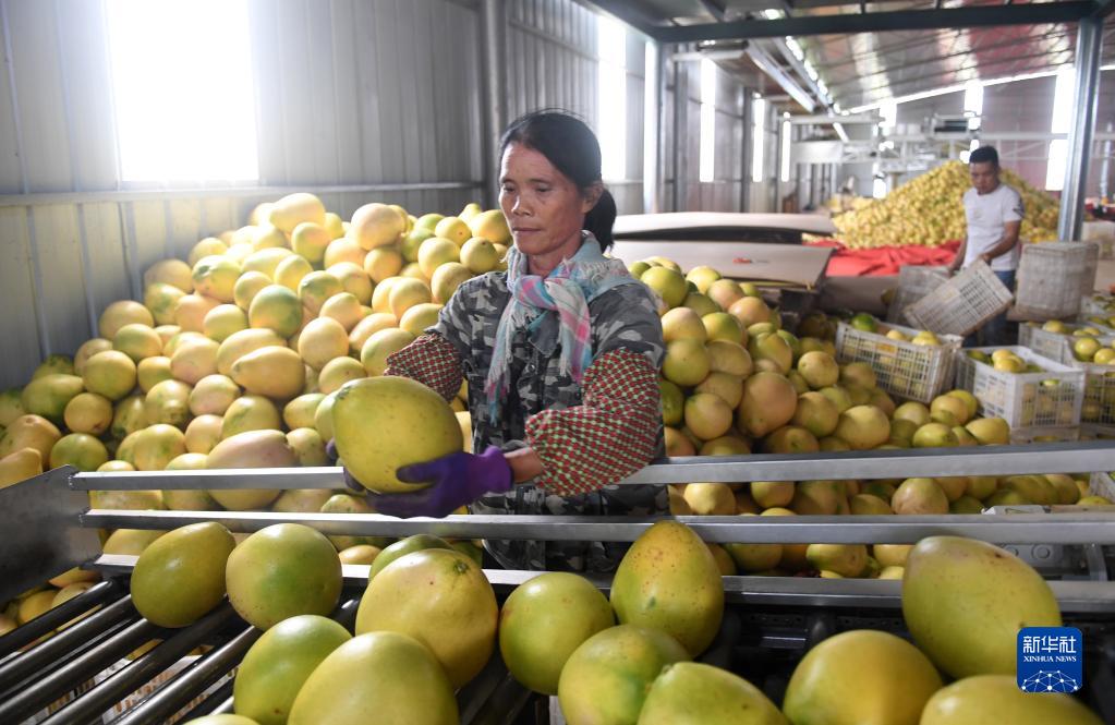 9月1日,在廣西南寧市西鄉塘區壇洛鎮富庶村,村民在分揀三紅蜜柚。