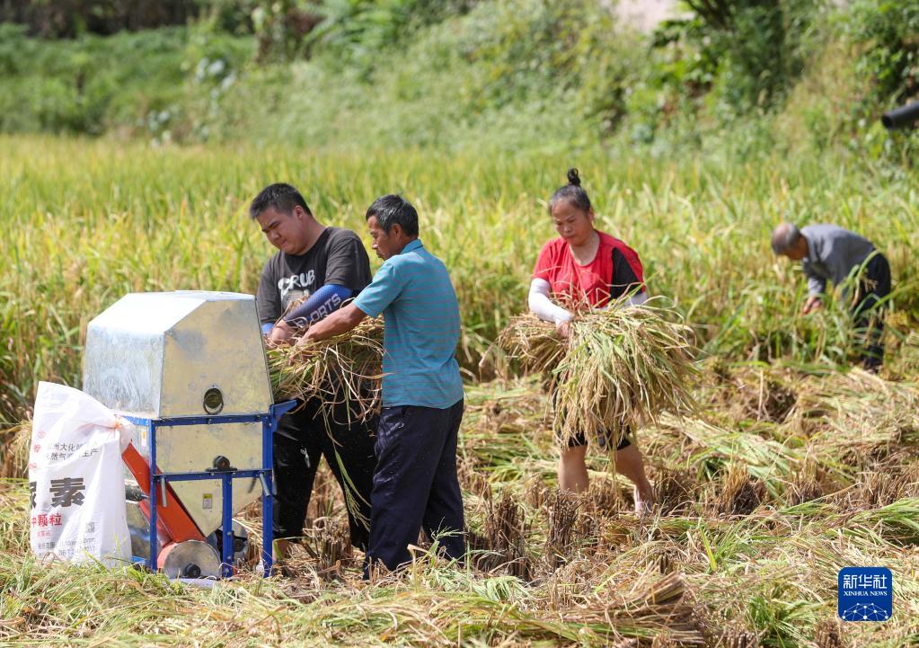 9月1日,在貴州省銅仁市玉屏侗族自治縣新店鎮(zhèn)新店村,村民在收獲水稻。