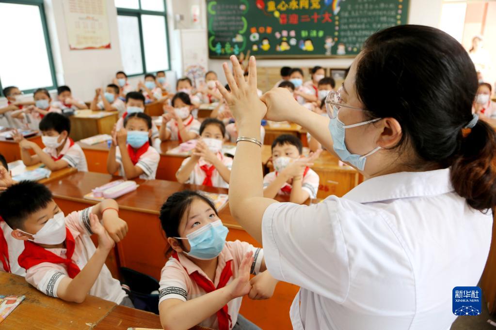 9月1日,在江蘇省連云港市院前小學,校醫給學生講解正確的洗手方法。