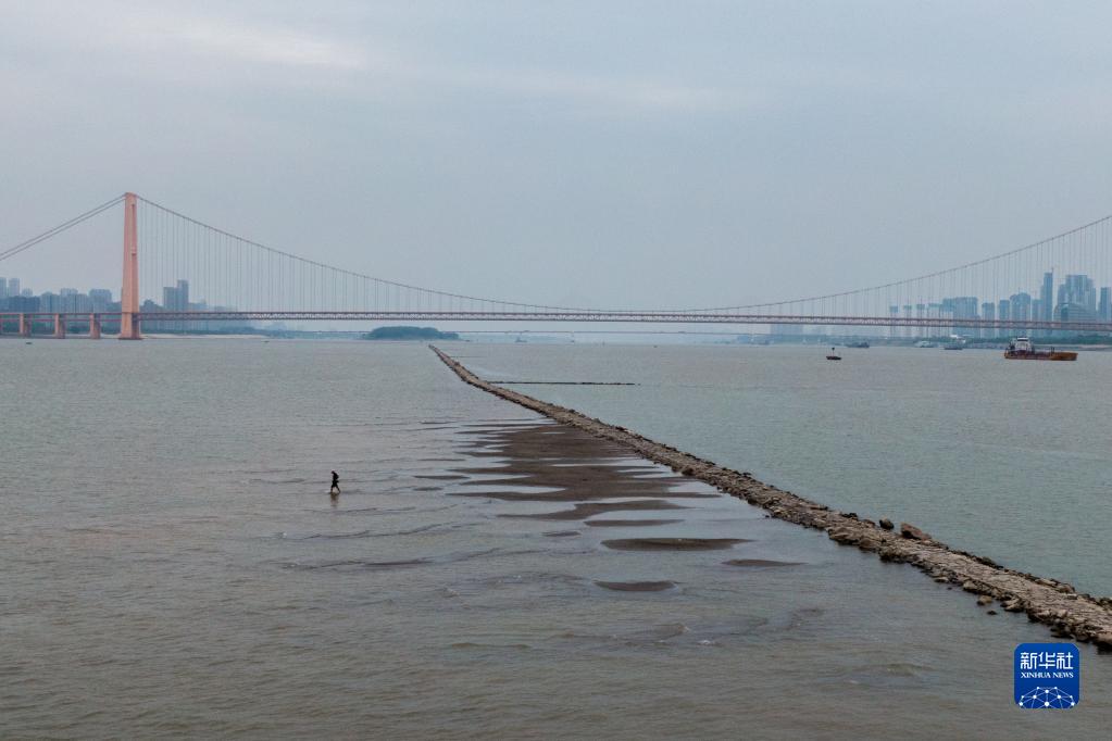 近日,長江武漢段水位持續降低,一條江心小道露出江面。截至9月1日20時,長江漢口站水位為14.67米,遠低于歷史同期平均水位。