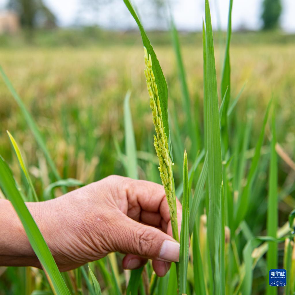 9月1日,在重慶市梁平區安勝鎮,再生稻技術專家黃華查看再生稻的生長情況。
