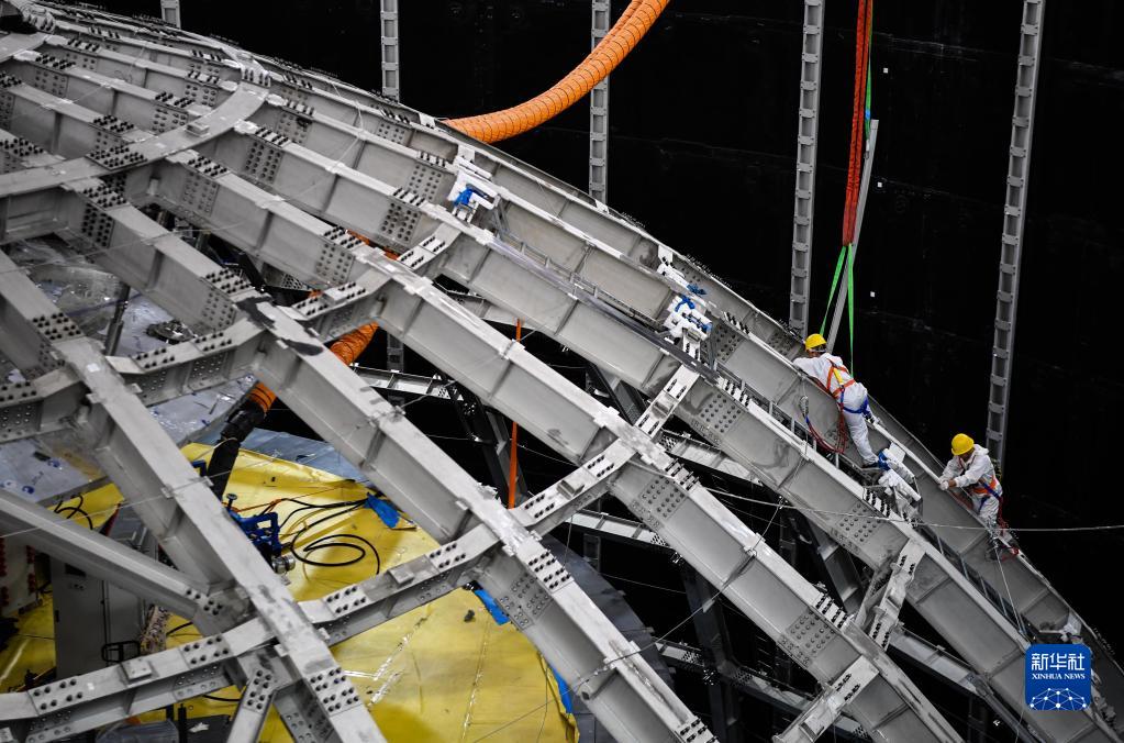9月2日,工作人員在江門中微子實驗探測器的不銹鋼結構上安裝作業。新華社記者 鄧華 攝