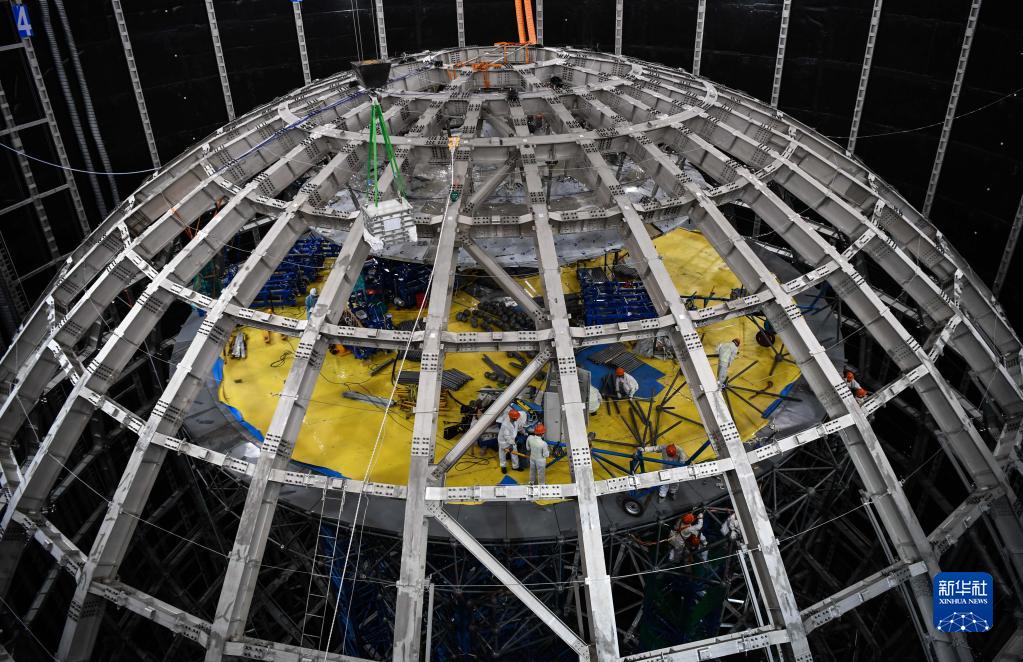 9月2日,工作人員在江門中微子實(shí)驗(yàn)探測器不銹鋼結(jié)構(gòu)內(nèi)部的升降平臺(tái)上安裝作業(yè)。新華社記者 鄧華 攝