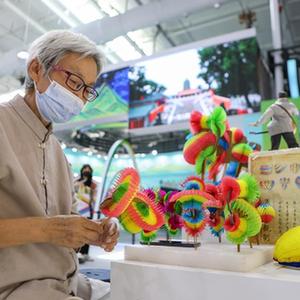 9月2日,在服貿會文旅服務專題展區,參展人員在展示皮影。2022年中國國際服務貿易交易會于8月31日至9月5日在位于北京的國家會議中心和首鋼園區舉辦。會上展示了眾多富有中國元素的特色展品,吸引了觀眾的目光。新華社記者 郝昭 攝