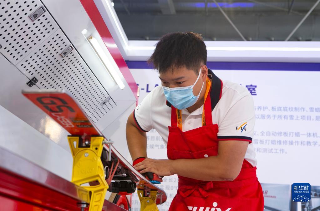 9月1日,一名工作人員在服貿會體育服務專題展區展示雪板保養工序。新華社記者 張帆 攝