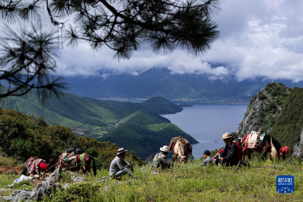 瀘沽湖馬幫隊隊員們在返程途中唱著山歌休憩(9月2日攝)。