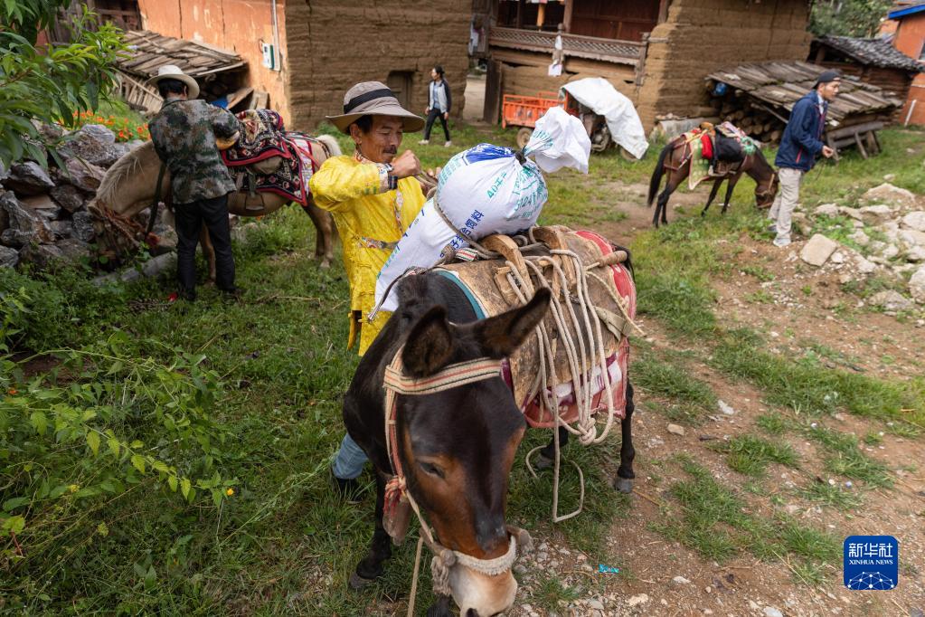 在鹽源縣瀘沽湖鎮(zhèn)木垮村,瀘沽湖馬幫隊(duì)隊(duì)員打包行李準(zhǔn)備出發(fā)上山(9月1日攝)。