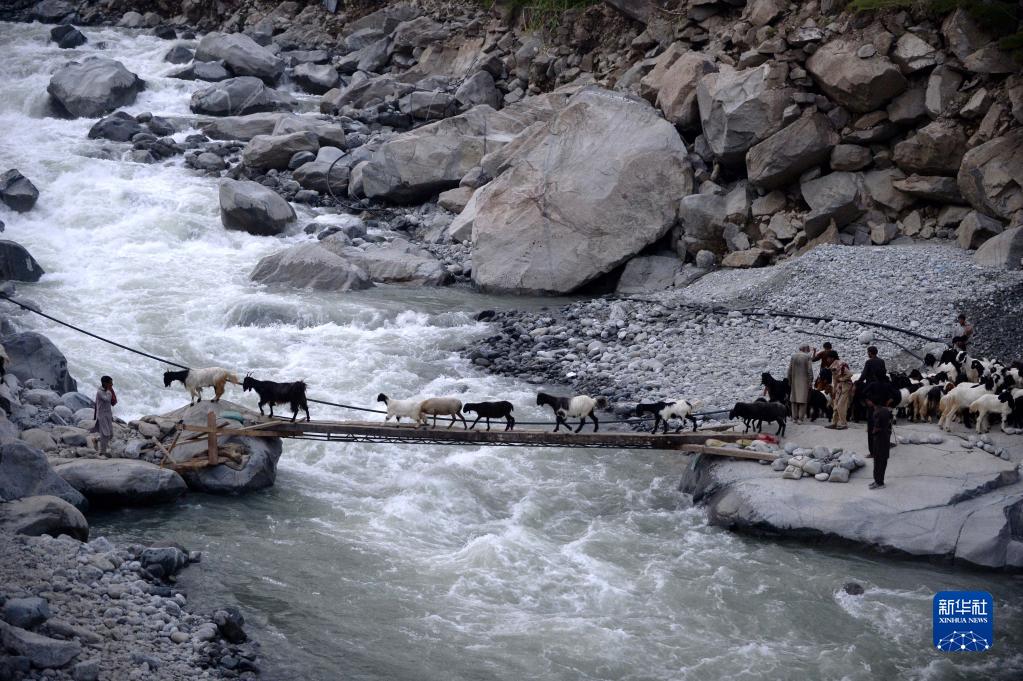 9月1日,在巴基斯坦開伯爾-普什圖省斯瓦特地區,牲畜在洪水后通過一座臨時搭建的小橋。