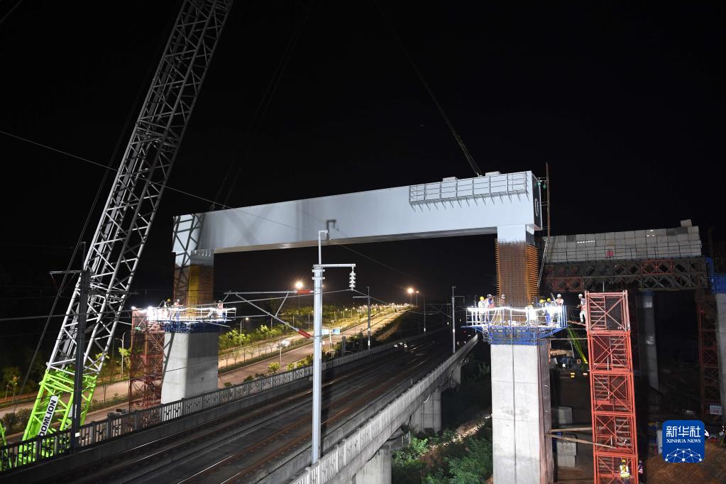 9月3日凌晨,中鐵十一局施工人員在進行門式墩鋼蓋梁吊裝作業。