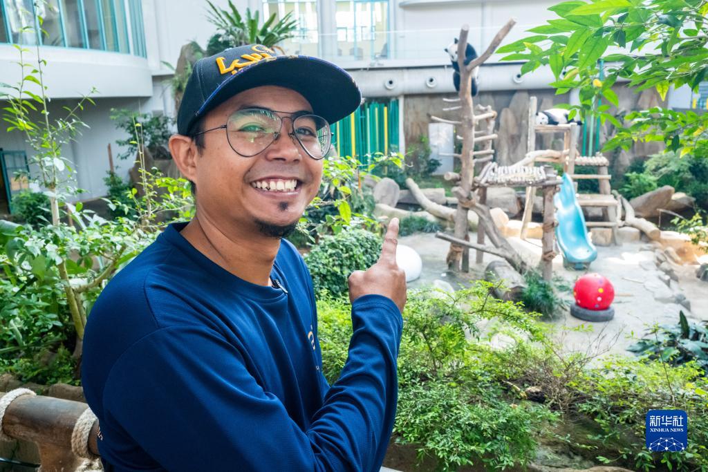 8月21日,在馬來西亞吉隆坡附近的馬來西亞國家動物園,飼養員阿克邁勒與大熊貓“靚靚”和“升誼”合影。