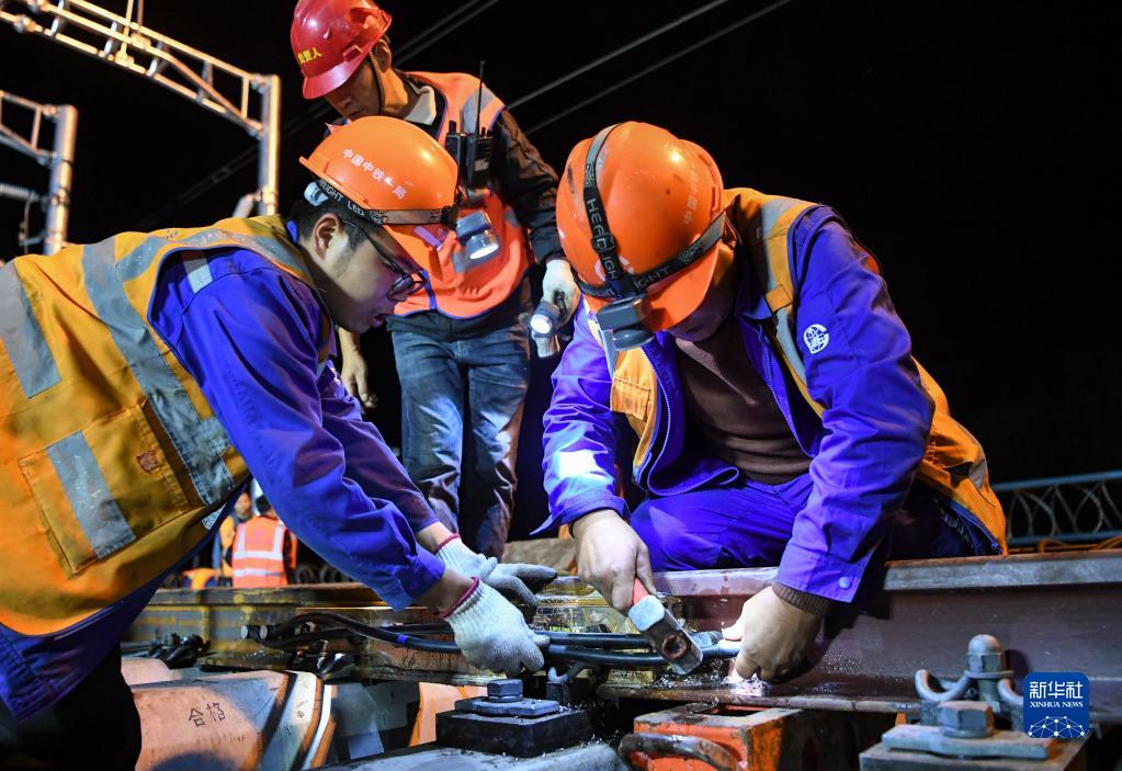 9月2日晚,工人在渝利鐵路沙子站增設客運設施項目作業。