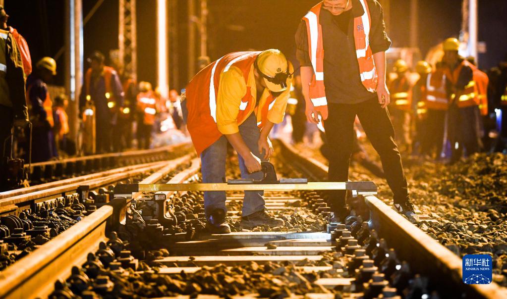9月3日凌晨,工人在渝利鐵路沙子站增設客運設施項目作業。