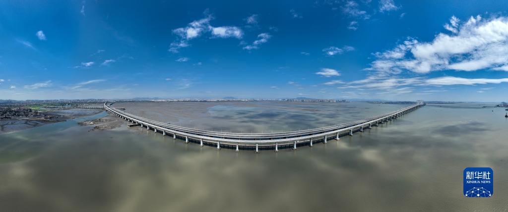 這是9月2日拍攝的新建福廈鐵路泉州灣跨海大橋(無人機合成照片)。