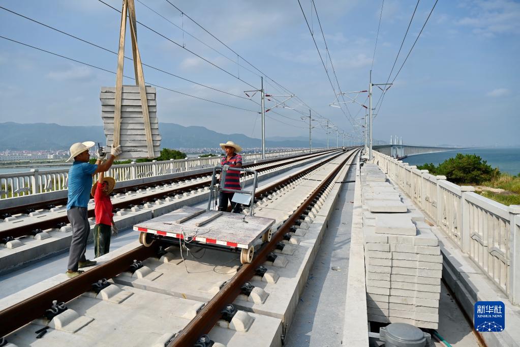 施工人員在新建福廈鐵路湄洲灣跨海大橋上作業(9月1日攝)。