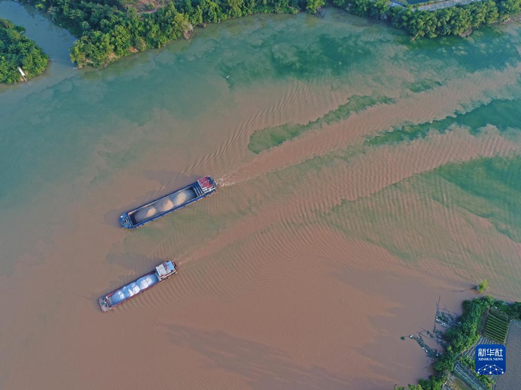 廣西南寧市江南區江西鎮三江口水域,左江與右江水在交匯處清濁交融(9月3日攝,無人機照片)。