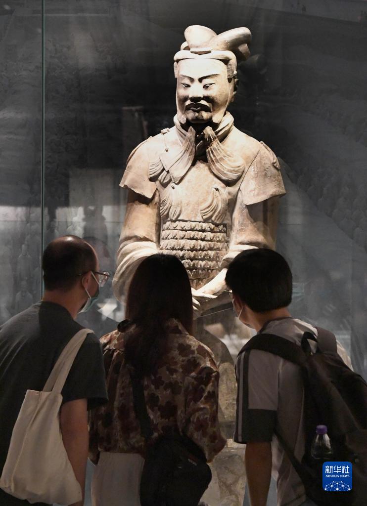 9月4日,參觀者在“繁星盈天——中國百年百大考古發現展”上觀看展品“高級鎧甲軍吏俑”。
