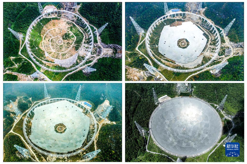 這是一張拼版照片:依次為“中國天眼”拼裝第一塊反射面板(左上,2015年8月2日攝)、“中國天眼”反射面板安裝近半(右上,2015年12月16日攝)、“中國天眼”反射面板安裝近八成(左下,2016年3月9日攝)、維護(hù)保養(yǎng)期間的“中國天眼”(右下,2022年7月21日攝)。